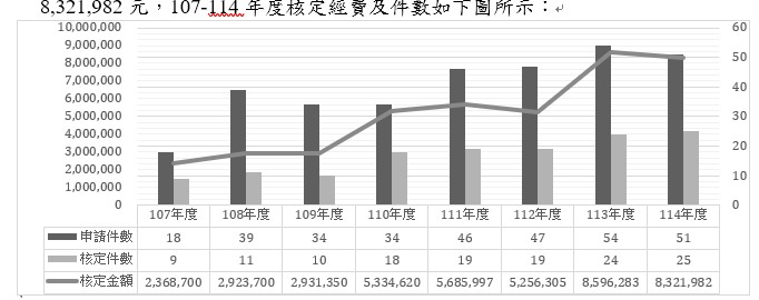 2. 114年度「大專校院教學實踐研究計畫本校通過率49.02%,核定補助總經費8,321,982元,107-114年度核定經費及件數如下圖所示: